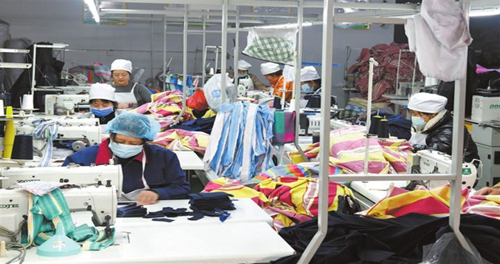 11月12日,在霍州市鸣梦老粗布有限公司的缝纫车间内,工人正在赶制粗布和服装订单。该公司主要生产纺...