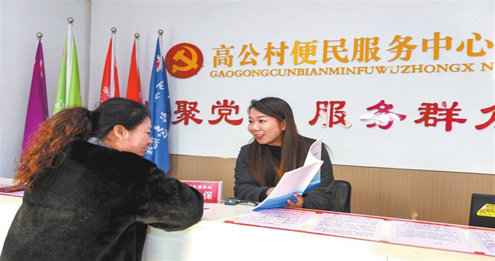12月21日,在洪洞县万安镇高公村便民服务中心,工作人员在为村民解答社保缴纳知识。高公村以“便民、...