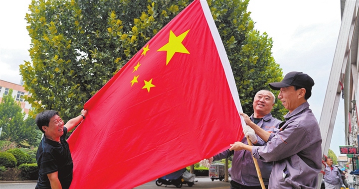 9月25日,在尧都区铁路东办事处铁桥社区日出东方小区,物业工作人员在悬挂国旗。连日来,市区主干街...