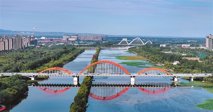 10月14日,航拍镜头下的汾河彩虹桥、锣鼓大桥、姑射桥交相呼应,景色优美。 汾河临汾段从南到北,...