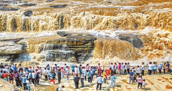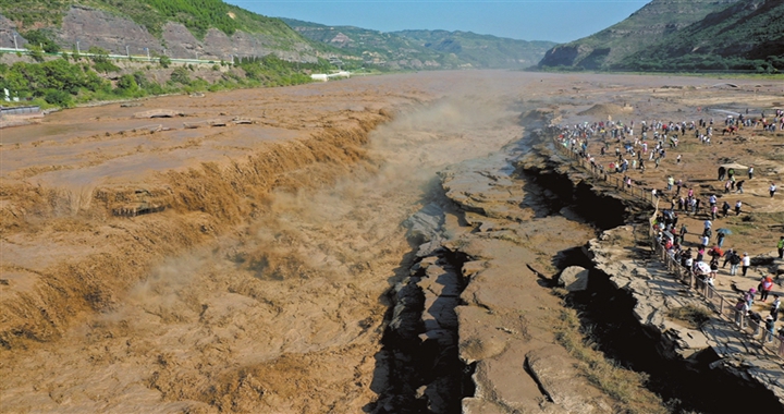 9月10日,在吉县黄河壶口瀑布景区,游客在拍照打卡。受黄河上游降雨量增多和水库放水影响,壶口瀑布...