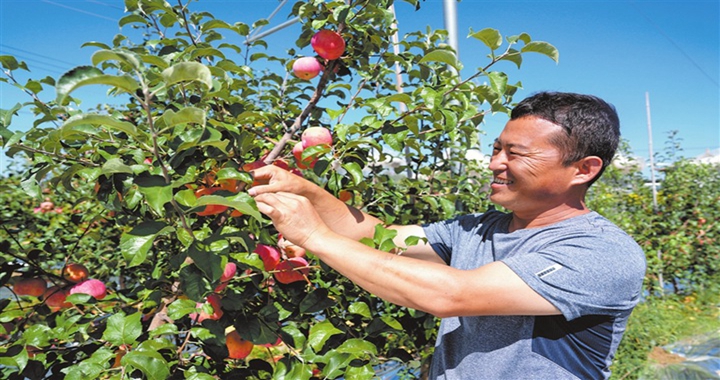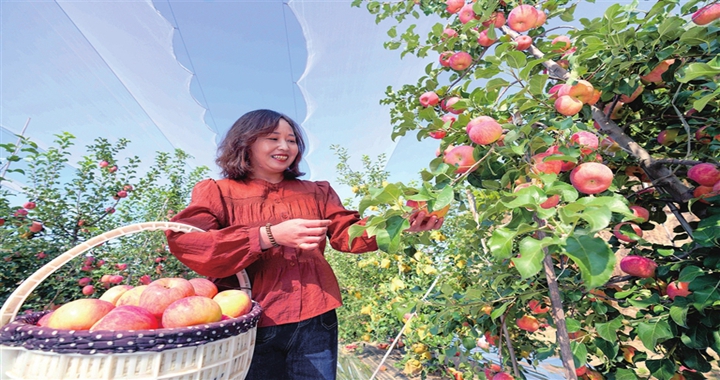 9月22日,在大宁县曲峨镇白村,游客在果园里采摘“宁脆”苹果。秋分时节,白村的570亩“宁脆”苹果丰...