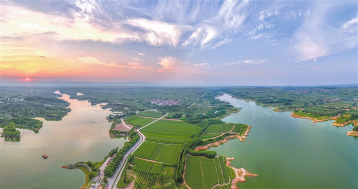 初秋时节,位于襄汾县的双龙湖国家湿地公园草木繁盛,景色怡人。田园、晚霞、村庄、道路相映成趣,勾...