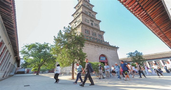 9月19日,游客在临汾铁佛寺博物馆参观游览。随着“跟着悟空游山西”活动的持续升温,铁佛寺博物馆游...