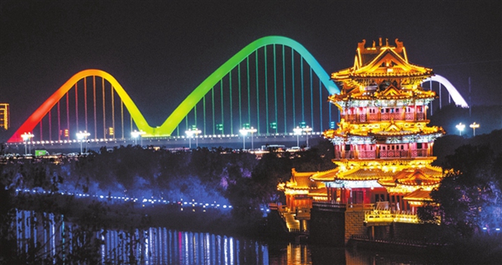 这是9月25日拍摄的市区汾河萱楼和姑射桥同框的夜景。近年来,我市不断提高城市品位,在提升硬实力、...