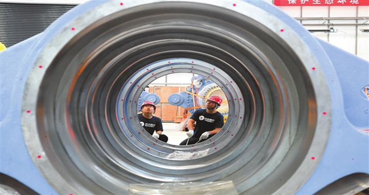 近日,在山西运达风电设备有限公司智能风电装备制造全产业链(襄汾)基地项目现场,工人在安装风电电机...