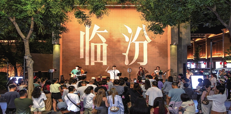 8月15日,在临汾青年街景音乐会演出现场,乐队歌手在与市民互动。临汾青年街景音乐会连续举办4年来,...