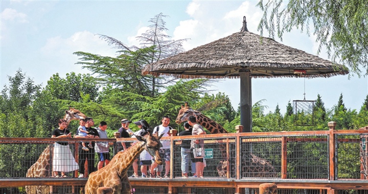 8月18日,在临汾市动物园,游客与长颈鹿近距离互动。进入暑期以来,临汾市动物园成为众多亲子游家庭...