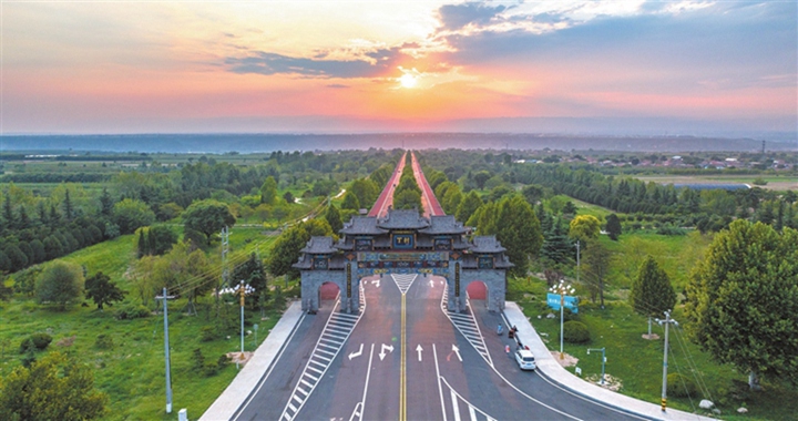 8月18日,航拍镜头下的黄河一号旅游公路临汾市襄汾县丁村旅游公路,在晚霞的映衬下,犹如一条玉带,...