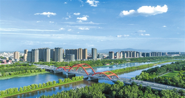 8月22日,航拍镜头下的临汾市汾河文化生态景区,蓝天如洗,碧水悠悠,天空中飘过的朵朵白云,与城市...