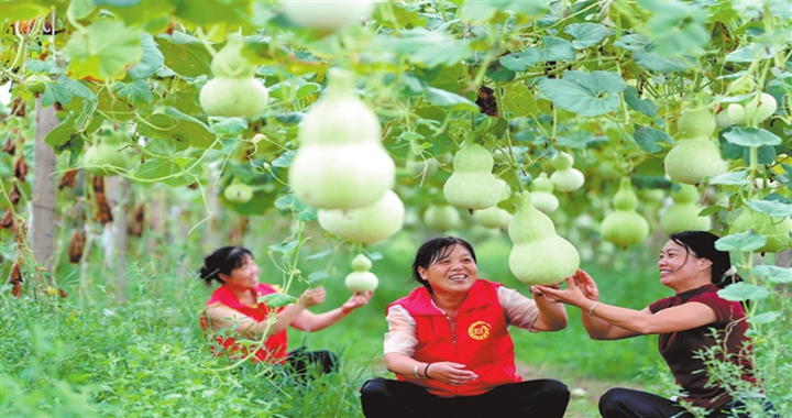 8月22日,在曲沃县里村镇中立村福禄种植专业合作社,村民在葫芦种植园察看葫芦长势。里村镇结合产业...