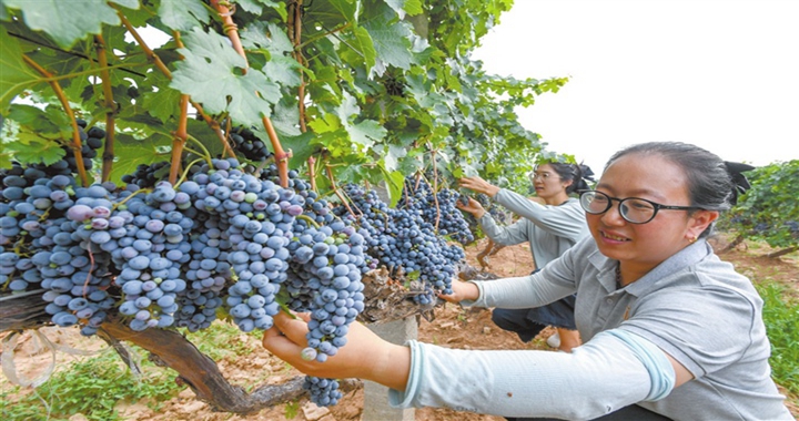 8月21日,在襄汾县尧京酒庄葡萄种植基地,技术人员在检查葡萄长势。眼下,尧京酒庄3500亩酿酒葡萄进...