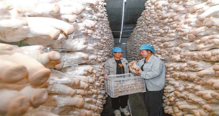 9月2日,在位于襄汾县的山西蓓鲜农业科技有限公司,工作人员在采摘杏鲍菇。该公司联合当地农户,打造...