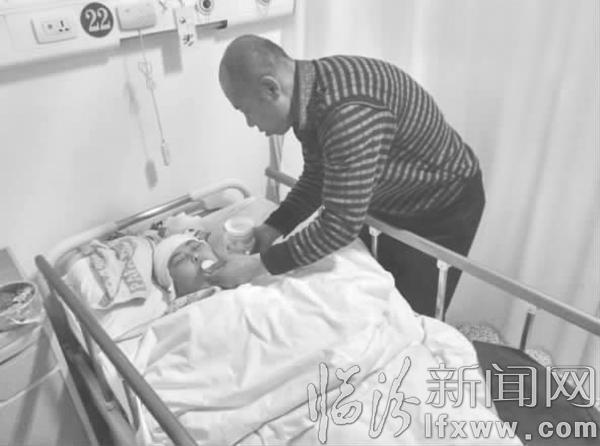 临汾新闻网讯 “好!张嘴,再喝一口……”12月19日9时许,临汾市中心医院神经外科的一间病房里,46岁的任红喜像哄孩子一样,正小心翼翼地给患有脑瘤的妻子刘安香喂饭。由于刚做完开颅手术,双目暂时失明的刘安香只能躺在病床上,艰难地吞咽着豆浆。