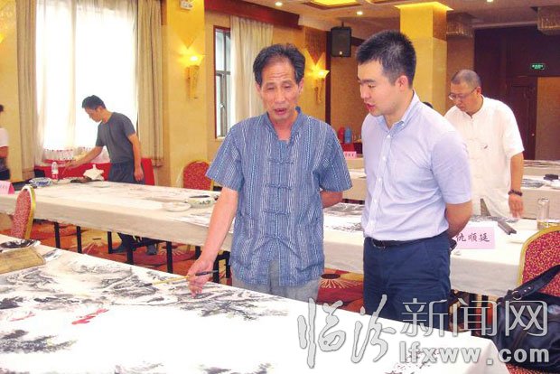 图为卢炳剑(左一)在百名画家画汾河笔会上现场挥毫。