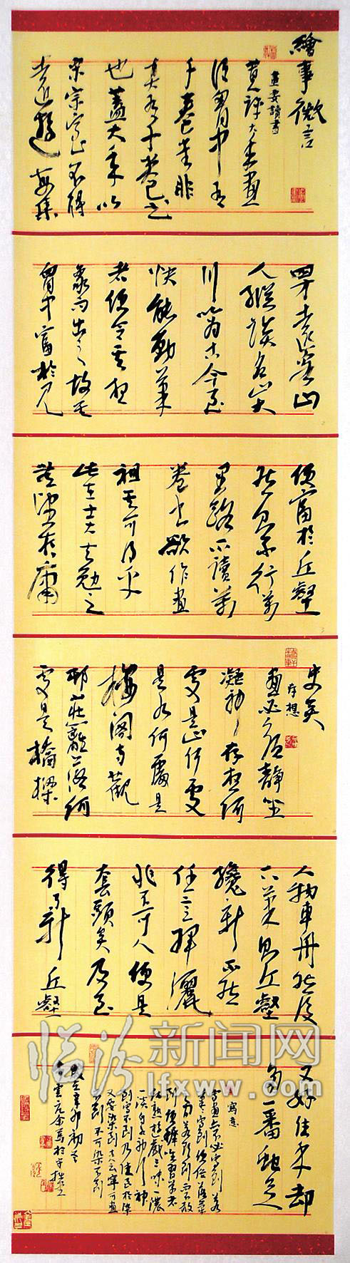 从2008年亢金马弃商从艺在中央美术学院进修,2010年在清华大学美术学院进修,2012年在首都师范大学深造,屈指数来已经整整五年了。10月中旬在古城公园的“大美临汾”亢金马书法展会给我们带来什么样的惊喜呢?让我们拭目以待。