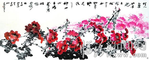 进学先生不仅在墨海弄潮,更喜欢点染丹青,他早年画过油画,有着很强的造型能力和色彩意识;他多年挥毫写字,有着扎实的线条功底,这为他中国画的创作奠定了很好的基础。潘天寿先生曾说:“画以书为高度,书以画为极则”。黄宾虹先生也说:“中国画诀在书诀,不观古人所论书法不能明,不考金石文字无以知造字之源流,即不知书画之用笔,笔法练习,画之先务”。“大抵作画当如作书,国画之用笔、用墨皆从书法中来“。由此可见,书法与国画的重要性。进学先生正是这种理论的践行者。他以潘天寿为形质,笔墨苍古,沉雄老辣,形简意远;以吴昌硕为精神,构图宏阔,浑厚苍茫,大气阳刚;他极力推崇“书画同源”的古训,画格以“龙门”为魂魄,将魏碑精神贯穿始终。力求以书入画、以画入诗,追求画中有书之境界。他以其浑厚的书法功底狂笔横扫,一洗牡丹画哗众之情态,不仅表现出大写意的外在特性,而且赋予作品以人文的文化理念,枯笔恣肆,质中求润,高雅清新,文义深邃,深刻地诠释了正宗中国画笔墨理念及物、情、意的文化表现,成为脱俗之典型。