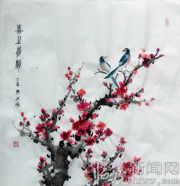 花开俊俏,喜上眉梢。鹊鸣枝头,好运来到