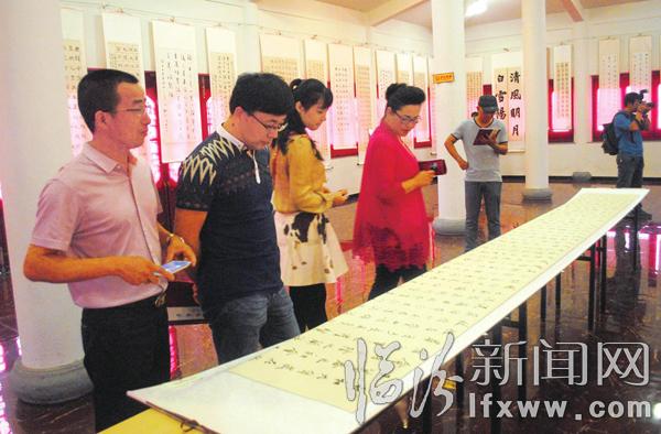 临汾新闻网讯 6月27日,由曲沃县文学艺术创作中心和曲沃县书法家协会联合举办的翰墨情缘——毓秀居柳卫俊书法、篆刻作品展在东城新区晋园晋宫门前举行开展仪式。此次以书法、篆刻艺术展的形式来集中展示了该县实施城建靓县、文化立县”和建设“美丽曲沃、幸福家园”等各方面发生的新变化、取得的新成就,受到广泛好评。李炳俊 摄