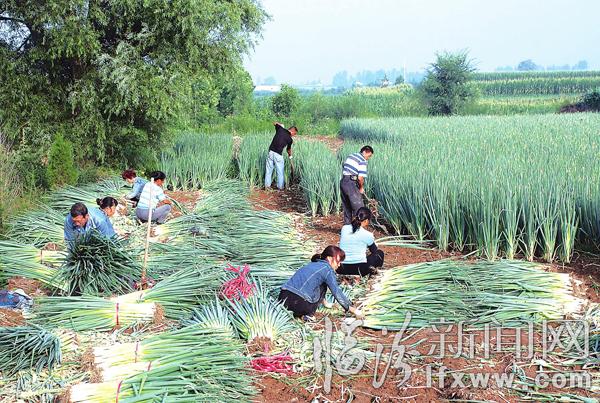 临汾新闻网讯 曲沃县北董乡是远近闻名的蔬菜基地,该乡李野村更是以种植大葱而名扬周边。今年大葱地头批发价格达到每公斤2.8元,较去年翻了一倍,亩均收益有望达到1.5万元左右。图为日前李野村种植户王春虎正在组织人力挖葱。 张荣 摄