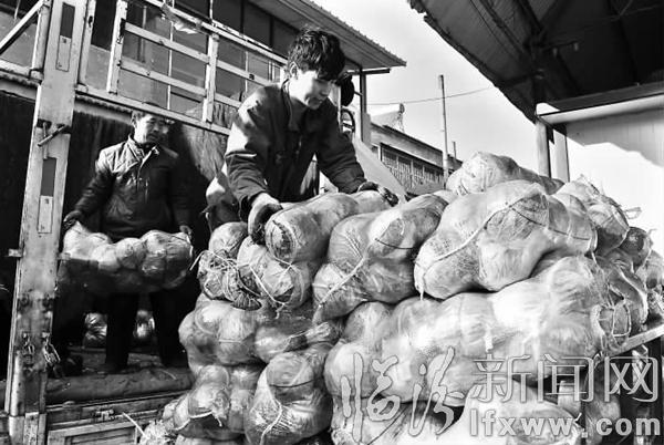 临汾新闻网讯 日前,曲沃县南吉菜市场向长期合作的蔬菜供应商了解蔬菜储备数量、质量、种类等信息,进行蔬菜储备工作,确保春节前蔬菜供应充足、价格稳定。图为工人正在搬运蔬菜。(张荣)