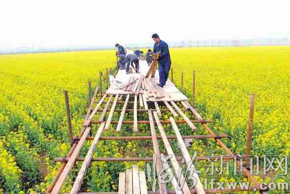 临汾新闻网讯 连日来,曲沃县太子滩农业园区的工作人员加班加点,在油菜“花海”中扛运钢管、抡锤打桩、铺设观光走廊平台和护栏,为4月16日开幕的曲沃首届太子滩文化旅游节做准备。 张荣 摄