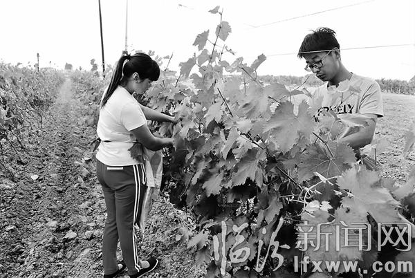临汾新闻网讯 曲沃县史村镇卫村已有20多年的葡萄种植历史,该村种植葡萄树2000余亩,并带动常村、西吉壁等周边村农民种植“巨峰”黑提”青提”等优质葡萄200余亩,仅此一项,每年可为农民增加收入80万余元。图为西吉壁村民石磊夫妇正在管理“青提”葡萄。 (张荣)