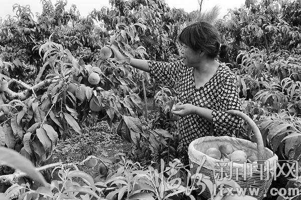 临汾新闻网讯 7月6日,曲沃县北董乡营里村村民朱新爱在自家丰收的桃园里忙着采摘成熟的桃子,她说:“今年桃子长势喜人,能稳赚好几万元呢……”该村土质肥沃、水源充足,产出的桃子以其果实大、色泽好、味道甜而一直深受广大消费者青睐。(张荣)