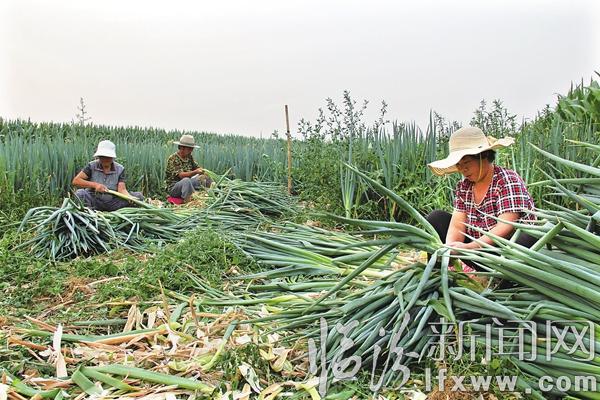 临汾新闻网讯 曲沃县北董乡是远近闻名的蔬菜基地,当地发展种植蔬菜达3万余亩,大葱、大蒜、洋葱等深受市场欢迎。图为日前该乡营里村种植户许祥埔家正在收获大葱。(张荣)