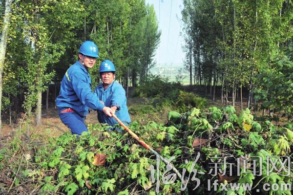临汾新闻网讯 11月4日,国网曲沃供电公司北董供电所员工,正在砍伐清除高压线下的树枝、杂草。北董乡是曲沃县的蔬菜种植大乡,有3条10千伏线路穿过千余亩菜地,供电所结合秋检巡视,清理障碍、排除隐患,既确保了辖区内线路设备可靠供电,又保障了菜农们的生产、生活安全。 记者 魏华 摄