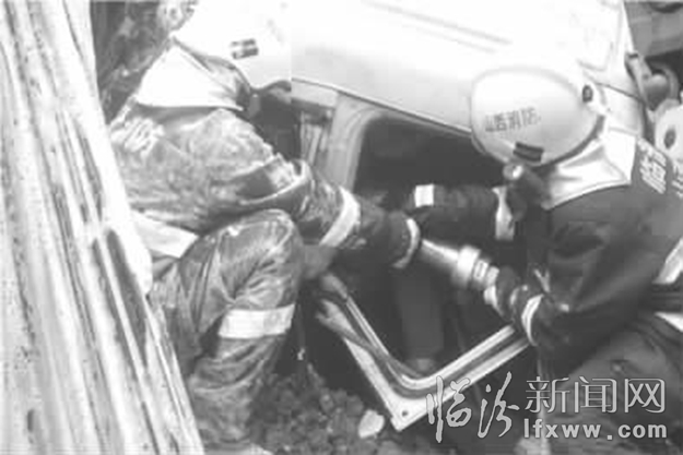 11时50分,官兵到达现场后发现,货车严重变形,驾室内被困两人。了解情况后,消防官兵坚持“救人第一”的原则,立即采取措施实施救援。第一小组首先利用警戒带对事故路段进行局部警戒,协助交警疏散堵塞车辆和现场的群众,防止发生二次事故;第二小组立即清理车头部分的残渣,利用破拆法将车头拉开为救人拓展足够空间,第三小组拿出一支泡沫枪对罐车进行冷却。战斗员利用破拆工具对车头进行破拆。经过60分钟紧张的救援,成功救出被困人员,并第一时间将被困人员移交给现场医护人员救治。