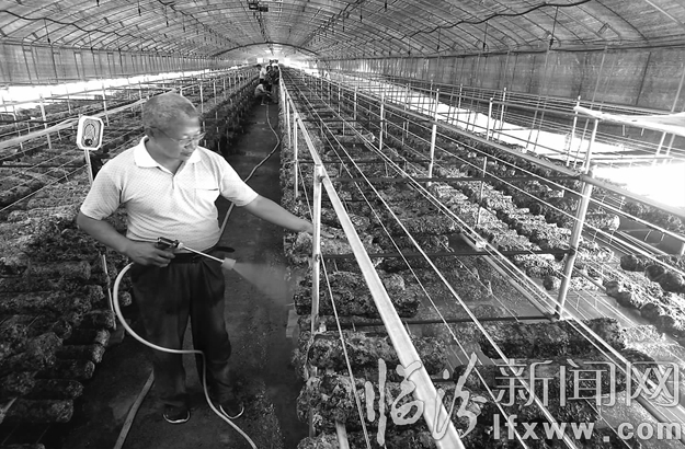临汾新闻网讯 曲沃县近年来把产业发展作为农民增收致富的主抓手,因地制宜,科学谋划,以产业基地建设为基础,通过龙头企业带动,走出了一条“企业+基地+农户+贫困户”的产业带动扶贫开发模式,得到村民的一致称赞。图为乐昌镇席村贫困户朱俊义正在给香菇菌棒喷水。