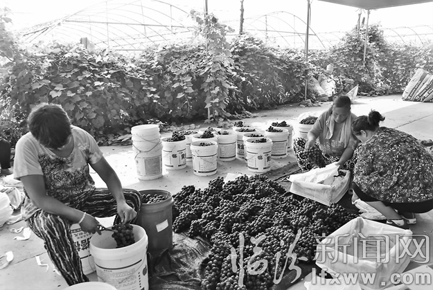 图为朝阳村村民在分拣刚采摘下来的夏黑葡萄,准备运往太原等地。