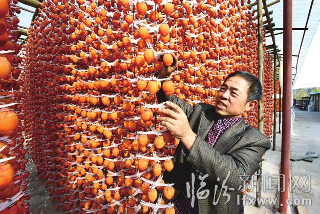 临汾新闻网讯 11月5日,曲沃县乐昌镇东韩村村民王玉成正在翻转挂晒的柿饼。