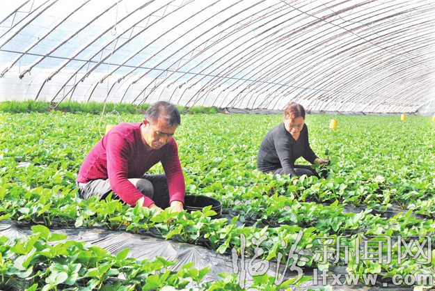 临汾新闻网讯 近日,在曲沃县史村镇西海村红运草莓园里,杨红运夫妇正在管护草莓苗。他们通过采取搭建空间大、采光好的无后墙第六代日光温室大棚,引进草莓新品种,施纯天然绿色无公害生态有机肥等相关措施,实现草莓达到个大、味甜的效果,有效增加收入。