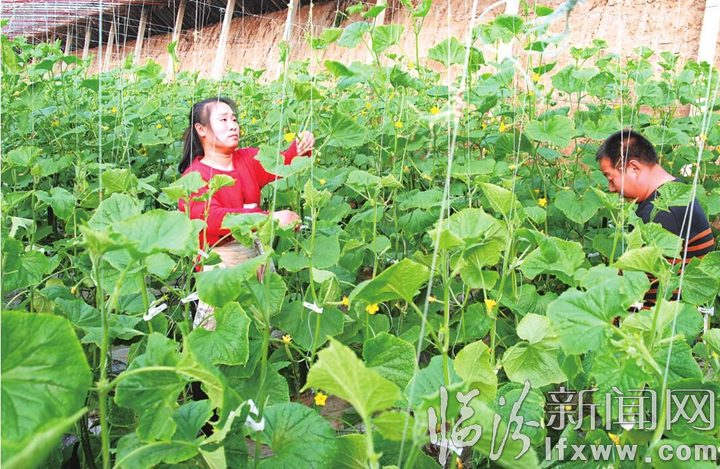 临汾新闻网讯 近年来,曲沃县乐昌镇安吉村依托长期形成的蔬菜种植优势,建起20余栋冬暖式日光温室大棚,取得了良好收益。图为近日安吉村菜农宋艳斌夫妇正在大棚内为黄瓜剥叶、掐丝。