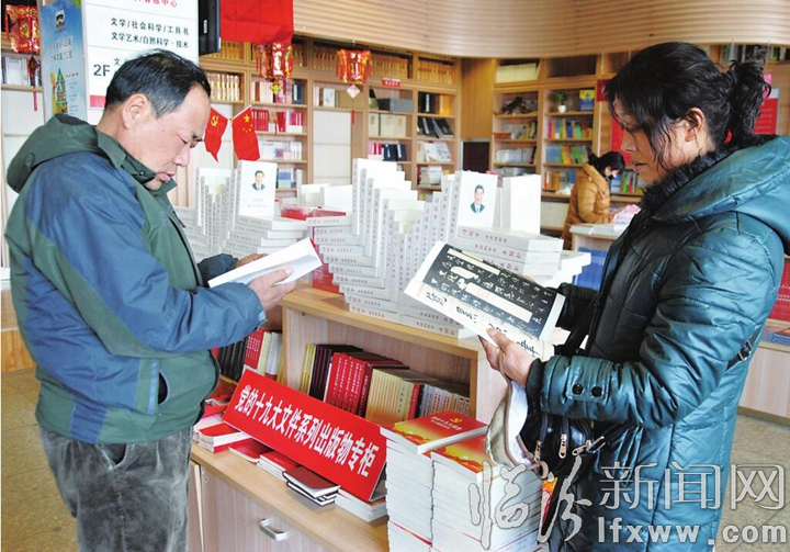 临汾新闻网讯 近日,在曲沃县新华书店内,市民在党的十九大文件系列出版物专柜阅读、选购图书。春节期间,曲沃县新华书店成为市民阅读充电、亲子学习的好去处,在阵阵书香中,人们选择用阅读度过一个颇有文化味儿的节日。