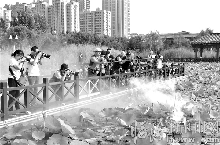 临汾新闻网讯 七月十四日,曲沃县晋园如意湖的荷花如约盛开,吸引了众多市民和摄影爱好者前来赏荷。图为侯马市摄影家协会组织三十余名摄影家在晋园摄影采风。