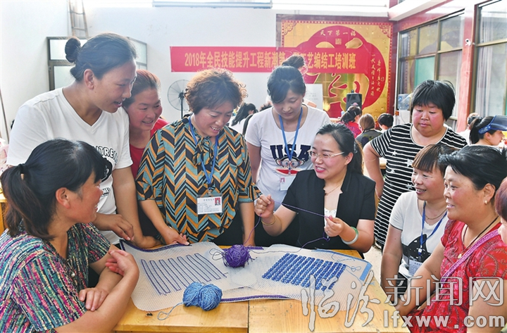 临汾新闻网讯 7月25日,在曲沃县里村镇中立村,曲沃新潮技校的老师在指导农村妇女工艺编织技巧。曲沃县2018全民技能提升工程新潮工艺编结工培训班开班以来,在小饰品、挂件、网店运营及销售等方面通过专业技能培训,让更多的手工编织爱好者、农村困难妇女参与到手工编织中,提升脱贫致富本领和自我发展能力。