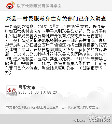 山西省吕梁市新闻办3日发布消息称,3月31日吕梁市兴县一村民因与地产商纠纷,在当地公安局二楼楼道内服毒身亡。目前,相关部门已介入调查,调查结果将随时公布。