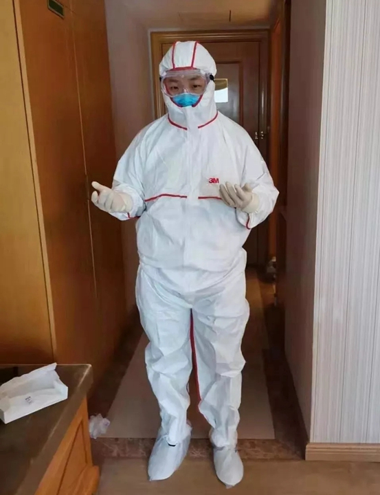 ▲身穿防护服的崔哲鑫