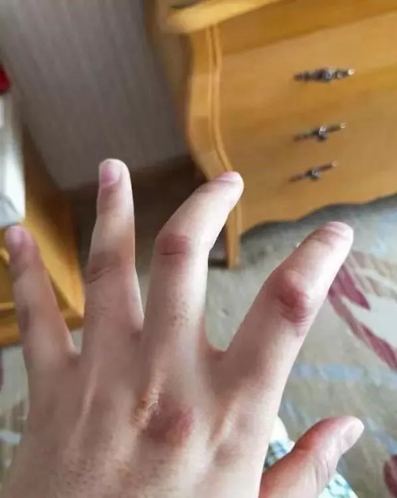 ▲白雪红肿破溃的双手