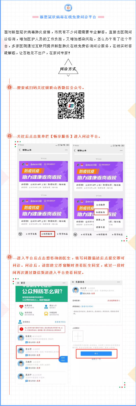 黄河新闻网讯(记者 李渊)面对新型冠状病毒肺炎疫情,市民有不少问题需要专业解答。直接去医院问诊咨询,增加医护人员的工作负担,又增加感染风险,怎么办?近日,记者获悉,银联山西联合近医通推出新冠病毒免费在线问诊平台,足不出户即可进行新冠筛查和线上问诊。