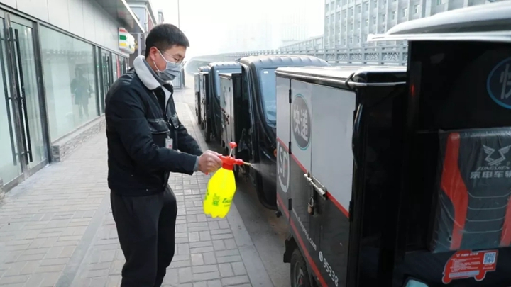 杨永栋载着消毒完毕的52件快递,开始了配送。他的第一站,是位于双塔东街的国大药房。