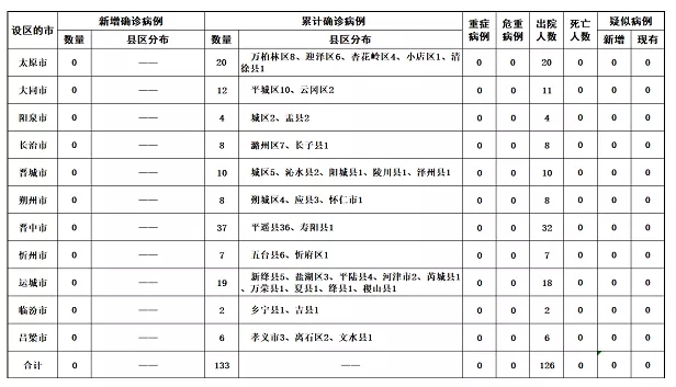 截至3月6日24时,山西省11个市累计报告新型冠状病毒感染的肺炎确诊病例133例。其中: