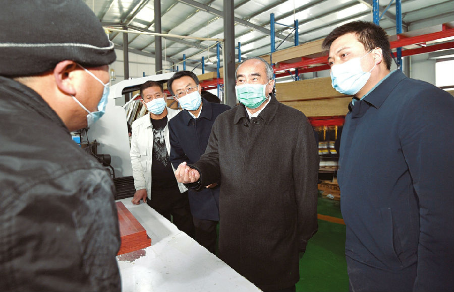 3月5日,省长林武在平定县扶贫产业园调研移民搬迁区贫困人员就近就业情况,走进车间看望复工上岗的易地搬迁户,叮嘱大家提高技能本领,勤劳增收致富。 本报记者 李兆民摄