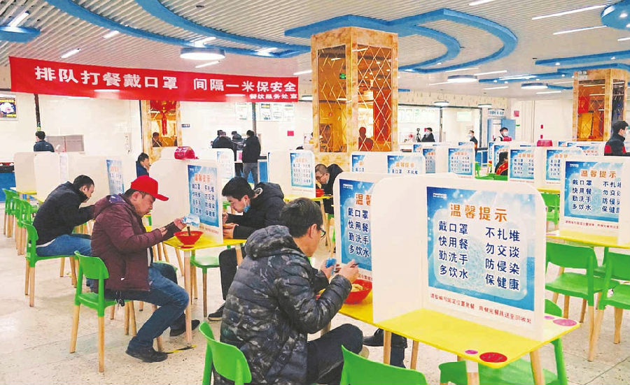 就餐实行错峰制,定点定位,单人隔板。 本报通讯员摄