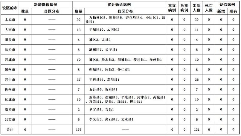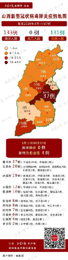 截至3月10日24时,山西省11个市累计报告新型冠状病毒感染的肺炎确诊病例133例。其中:
