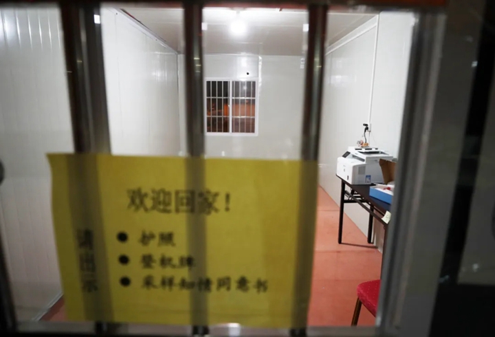 在航站楼外的停机坪上有4间采样室,每间采样室2名工作人员,来自山西省人民医院的4名医生负责采样,海关人员负责询问和信息登记、转运样本等。负责采样的医生王敏介绍说:“以前都是采集咽拭子样本,今天是第一次采集鼻咽拭子样本,准确度会更高。”