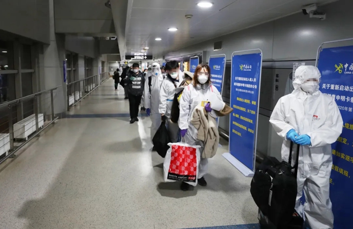 登机检疫是第一项流程。舱门打开,登机检疫组人员进入机舱内,通过医学排查,在最短时间内锁定有症状人员和密切接触者,并进行分类。登机检疫后,旅客按照分类分批下机。